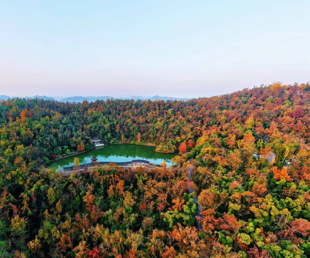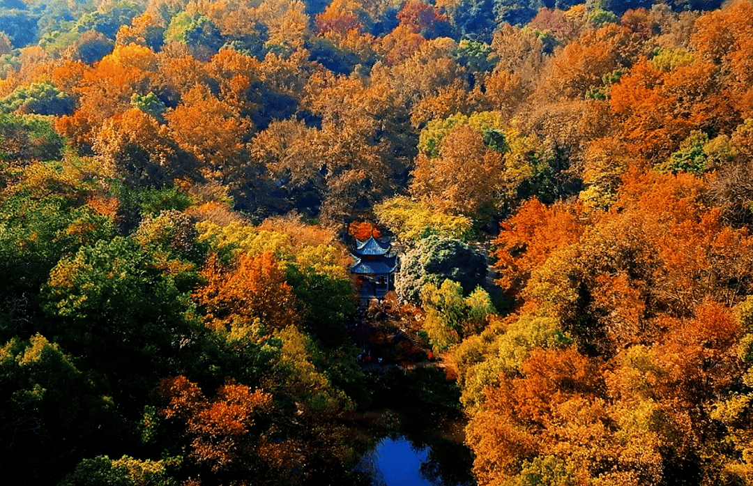 岳麓山中的爱晚亭与枫林堪称绝配,这座因杜牧诗句“停车坐爱枫林晚”而得名的古亭,是观赏枫叶的灵魂所在。朱红亭角从层层浸染的红黄枫叶中探出,本身就是一幅活的中国画。在这里看枫叶,看的不仅是颜色,更是唐诗的意境。